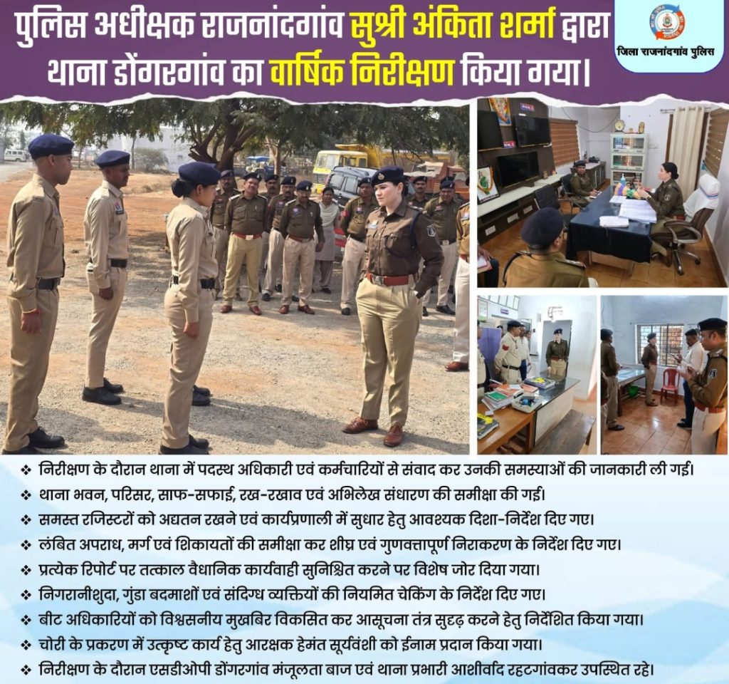 30.01.2026 को पुलिस अधीक्षक राजनांदगांव सुश्री अंकिता शर्मा द्वारा थाना डोंगरगांव का वार्षिक निरीक्षण किया गया। निरीक्षण के दौरान थाना में पदस्थ अधिकारी एवं कर्मचारियों से संवाद कर उनकी समस्याओं से अवगत होते हुए उनके निराकरण हेतु आवश्यक निर्देश दिए गए। पुलिस अधीक्षक द्वारा थाना भवन एवं थाना परिसर का निरीक्षण कर साफ-सफाई, रख-रखाव, अभिलेख संधारण तथा थाना के समस्त रजिस्टरों को अद्यतन रखने के संबंध में दिशा-निर्देश दिए गए। निरीक्षण के दौरान विवेचकों के पास लंबित अपराध, मर्ग एवं शिकायतों की गहन समीक्षा कर शीघ्र एवं गुणवत्तापूर्ण निराकरण सुनिश्चित करने हेतु निर्देशित किया गया।इसके अतिरिक्त थाना में प्राप्त होने वाली प्रत्येक रिपोर्ट पर तत्काल वैधानिक कार्यवाही करने, थाना के निगरानीशुदा एवं गुंडा बदमाशों तथा संदिग्ध व्यक्तियों की नियमित रूप से चेकिंग करने के निर्देश दिए गए। साथ ही बीट अधिकारी एवं कर्मचारियों को अधिक से अधिक विश्वसनीय मुखबिर विकसित कर आसूचना तंत्र को मजबूत करने पर विशेष जोर दिया गया। पुलिस अधीक्षक महोदया द्वारा आरक्षक हेमंत सूर्यवंशी को चोरी के प्रकरण में अच्छा कार्य करने के लिए ईनाम भी दिया गया। निरीक्षण दौरान अनुभागीय अधिकारी (पुलिस) डोंगरगांव मंजूलता बाज एवं थाना प्रभारी आशीर्वाद रहटगांवकर उपस्थित रहे।