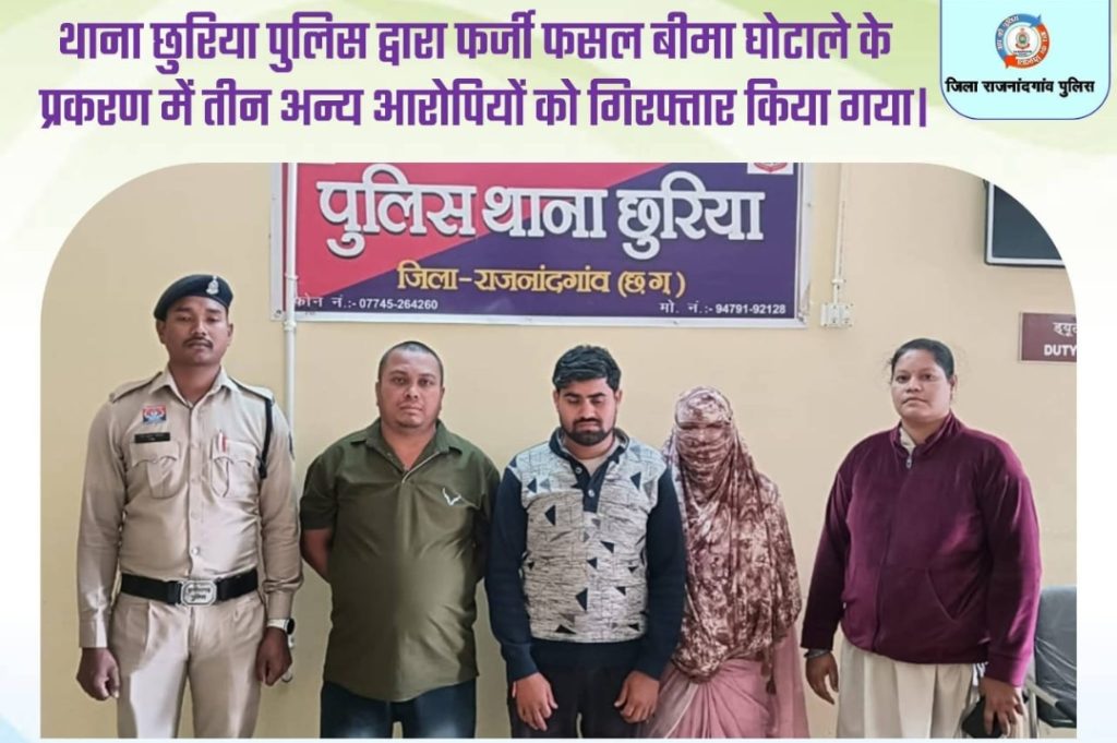 राजनांदगांव /दूसरे की भूमि, जिसमें केले की फसल लगी थी, को किराये पर लेकर उसमें चना फसल बोने का झूठा विवरण प्रस्तुत कर फर्जी फसल बीमा कराकर बीमा राशि अपने बैंक खातों में अंतरित कराने वाले तीन और आरोपियों को थाना छुरिया पुलिस द्वारा किया गया गिरफ्तार।गिरफ्तार आरोपियों को भेजा गया न्यायिक रिमांड पर । मामले का संक्षिप्त विवरण: ग्राम आमगांव, थाना छुरिया स्थित रैलिस बायो एनर्जी प्रा. लिमिटेड के पार्टनर जय बग्गा, वैभव गोलछा एवं सुदर्शन वर्मा के नाम दर्ज 34 खसरा, लगभग 50 हेक्टेयर से अधिक भूमि पर विगत एक वर्ष से अधिक समय से केले की फसल लगी हुई थी। उक्त भूमि पर वर्ष 2024-25 में चना फसल दर्शाकर फर्जी तरीके से विभागीय योजना के राशि 23,28,944.35/- रुपए को अमित वर्मा पद ब्लॉक कोऑर्डिनेटर भारतीय कृषि बीमा कंपनी एवं सीएससी संचालक परमेश्वर साहू के विरुद्ध कृषि विभाग द्वारा लिखित प्रथम सूचना रिपोर्ट दर्ज कराने पर आरोपीगण अमित वर्मा एवं परमेश्वर साहू के विरुद्ध अपराध क्रमांक 294/2025 धारा 316(5), 318(4), 336(2), 336(3), 338, 340(2), 61(2) बीएनएस के तहत 12.12.2025 को अपराध पंजीबद्ध कर विवेचना में लिया गया था । विवेचना कार्यवाही दौरान घटना कारित करने वाले दो आरोपीयों आरोपीयान 1. अमित वर्मा एवं 2. परमेश्वर साहू को दिनांक 14/12/2025 को मामले में गिरफ्तार कर माननीय न्यायालय के समक्ष पेश कर न्यायिक रिमाण्ड प्राप्त कर जेल भेजा गया था । 02/02/2026 को घटना में संलिप्त तीन अन्य आरोपीगण – 1. हेमंत वैष्णव पिता पवन कुमार वैष्णव उम्र 38 निवासी ग्राम चचौद (श्यामनगर) थाना राजिम जिला गरियाबंद हाल किरगहाटोला थाना छुरिया जिला राजनांदगांव छत्तीसगढ़ 2. बालमुकुंद जंघेल पिता माखनराम उम्र 29 निवासी सुराडबरी थाना छुईखदान जिला के. सी. जी. छत्तीसगढ़ एवं 03. रूखमणि कंवर चंद्रवंशी पति नरेंद्र चंद्रवंशी उम्र 30 निवासी गोपालपुर थाना छुरिया जिला राजनांदगांव छत्तीसगढ़ के द्वारा भी अपराध घटित करना पाए जाने पर उनका पता तलाश कर अभिरक्षा में लेकर पूछताछ करने पर अपराध घटित करना स्वीकार करने पर तीनों आरोपियों को मामले में आज 02/02/2026 को विधिवत गिरफ्तार कर माननीय न्यायालय के समक्ष न्यायिक रिमाण्ड हेतु भेजा गया है। प्रकरण में विवेचना जारी है, विवेचना दौरान अन्य आरोपियों के संलिप्तता पाए जाने पर उनके विरुद्ध वैधानिक कार्यवाही की जाएगी।