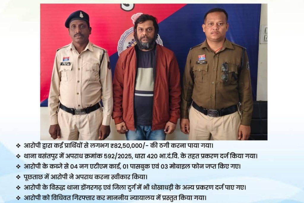 मामले का संक्षिप्त विवरण :- कई प्रार्थियों द्वारा लिखित शिकायत प्रस्तुत की गई थी कि धनीराम सिन्हा नामक व्यक्ति द्वारा शेयर मार्केट में पैसा निवेश कराने पर राशि दोगुनी कर वापस करने का झांसा देकर धोखाधड़ी की गई है। शिकायत पर थाना बसंतपुर में अपराध क्रमांक 592/2025, धारा 420 भा.दं.वि. के तहत अपराध पंजीबद्ध कर विवेचना में लिया गया। तकनीकी साक्ष्यों के आधार पर आरोपी के उत्तरप्रदेश के गाजियाबाद क्षेत्र में होने की जानकारी प्राप्त हुई। गठित टीम द्वारा गाजियाबाद, ग्रेटर नोएडा के गौर सिटी क्षेत्र में दबिश देकर घेराबंदी कर आरोपी को पकड़ा गया। पूछताछ में आरोपी ने अपना नाम धनीराम सिन्हा बताया तथा अपराध करना स्वीकार किया। आरोपी के कब्जे से 04 एटीएम कार्ड, 01 पासबुक एवं 03 मोबाइल फोन जप्त किए गए। जांच में यह तथ्य सामने आया कि आरोपी द्वारा कई प्रार्थियों से शेयर मार्केट में अधिक मुनाफा दिलाने के नाम पर लगभग ₹82,50,000/- की धोखाधड़ी की गई है। आरोपी के विरुद्ध थाना बसंतपुर के अतिरिक्त थाना डोंगरगढ़ (जिला राजनांदगांव) एवं जिला दुर्ग में भी धोखाधड़ी के प्रकरण दर्ज पाए गए हैं।