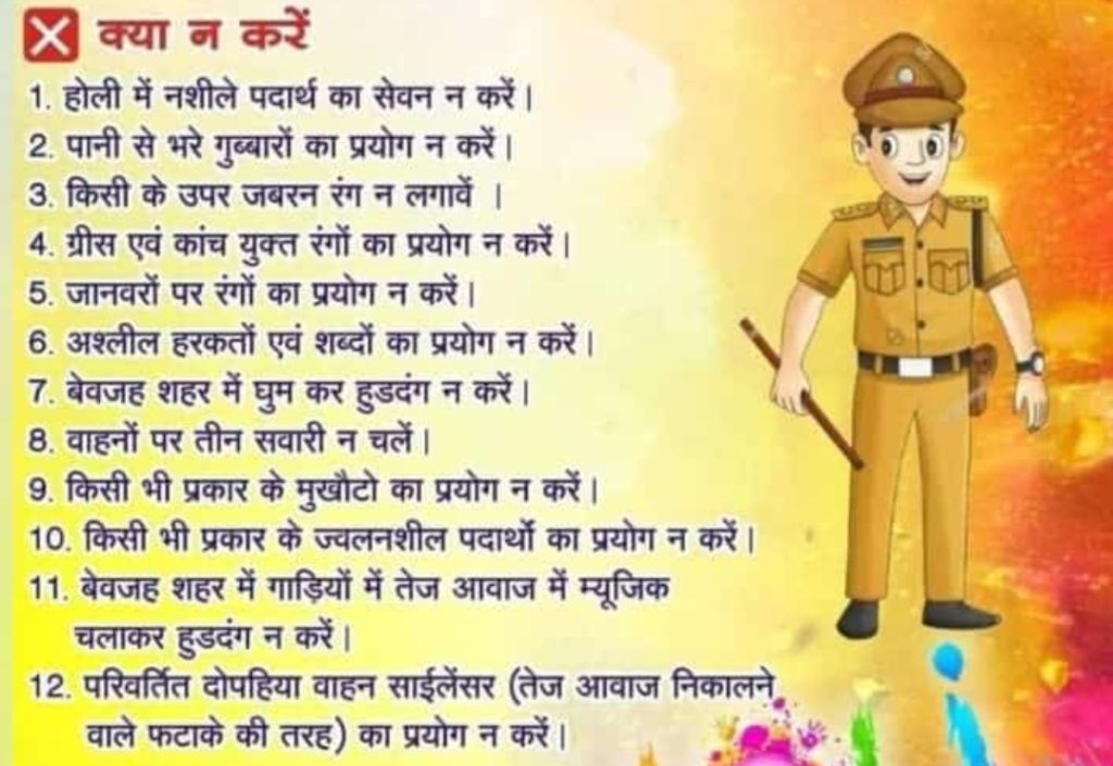 मुखौटे धारण कर किसी प्रकार अप्रिय हरकत न करें।हानिकारक पदार्थों जैसे पेन्ट, किचड़, ग्रीस, मैला आदि का उपयोग न करें न ही अनचाहे रंगों का उपयोग करें। नशापान न करें न ही अश्लील शब्दों का प्रयोग करें। महिलाओं पर छिटाकशी न करें। दुपहिया वाहन में तीन सवारी न बैठें, न ही शराब पीकर/नशीले पदार्थों का सेवन कर वाहन चलावें। हरे-भरे वृक्षों की कटाई या शासकीय/सार्वजनिक व निजी सम्पत्ति को होली में न जलायें। होलिका दहन के पूर्व होलिकोत्सव समिति का गठन कर होलिका दहन निर्धारित समय पर करें। किसी प्रकार आपसी, पुरानी, रंजिस को लेकर होली के बहाने ऐसा कोई कार्य न करें, जिससे कोई अप्रिय स्थिति निर्मित हो।
