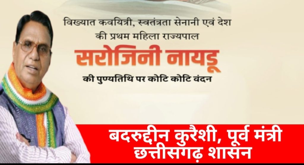 भिलाई/छत्तीसगढ़ के पूर्व मंत्री बदरुद्दीन कुरैशी ने कहा कि, आज 2 मार्च को भारत की स्वतंत्रता संग्राम की महान सेनानी, प्रख्यात कवित्री और ओजस्वी वक्ता सरोजिनी नायडू की पुण्यतिथि मनाई जाती है । उन्हें “भारत कोकिला” के नाम से भी जाना जाता है । उनका जन्म 13 फरवरी 1879 को हुआ था और भी स्वतंत्रता आंदोलन में अग्रणी भूमिका निभाने वाली पहली भारतीय महिलाओं में से एक थी । वह भारतीय राष्ट्रीय कांग्रेस की सक्रिय सदस्य रही और वर्ष 1925 में कानपुर अधिवेशन में कांग्रेस के अध्यक्ष बनी । उन्होंने महात्मा गांधी के साथ नमक सत्याग्रह तथा असहयोग आंदोलन में भाग लिया और अनेक बार जेल भी गई । स्वतंत्र भारत में वे उत्तर प्रदेश की पहली महिला राज्यपाल बनी । उनकी पुण्यतिथि पर हम उनके राष्ट्र प्रेम त्याग और नेतृत्व को नमन करते हुए देश सेवा के उनके आदर्शों को अपनाने का संकल्प लेते हैं । आज उनकी पुण्यतिथि पर भावपूर्ण श्रद्धांजलि अर्पित करता हूं।