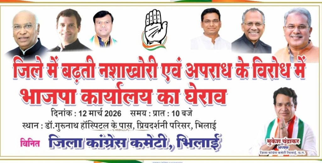 भिलाई/प्रदेश छत्तीसगढ़ कांग्रेस कमेटी के निर्देश व भिलाई जिला कांग्रेस कमेटी के अध्यक्ष मुकेश चंद्राकर के अगुवाई मे कल 12 मार्च को भिलाई जिला भाजपा कार्यालय के घेराव किया जाएगा। इसमें सभी कांग्रेसजनों को अधिक से अधिक संख्या मे पहुंचकर छत्तीसगढ़ मे नशाखोरी एवं बढ़ती मंहगाई के विरोध मे एक होकर भाजपा सरकार के खिलाफ अपनी आवाज को बुलंद करना होगा जिसका प्रमुख कारण है हमारे छत्तीसगढ़ के हर बच्चे इस नशाखोरी मे शामिल होते जा रहे हैं और आज जो मंहगाई रोज बढ़ रही है,गैस सिलेंडर नहीं मिल रहा है इस मंहगाई में गरीबों का जीना मुश्किल हो गया है आज के हालात को देखते हुए कल 12 मार्च को एक दिवसीय धरना प्रदर्शन मे एक एक कांग्रेस के कार्यकर्ता बूथ, वार्ड,ब्लॉक और जिला के समस्त पदाधिकारी को आवश्यक रुप मे इस कार्यक्रम मे अपनी उपस्थिति दर्ज करानी है। आप सभी कांग्रेसजनों से पुनः आग्रह करता हूं आज जो छत्तीसगढ़ के हालात को देखते हुए हमे अपनी सहभागिता निभानी है। कल दिनांक 12 मार्च सुबह 10 बजे सुपेला पहुंच कर कार्यक्रम को सफल बनायें। उक्त जानकारी चंद्रकांत कोरे,प्रवक्ता एवं मिडिया प्रभारी ने दी।