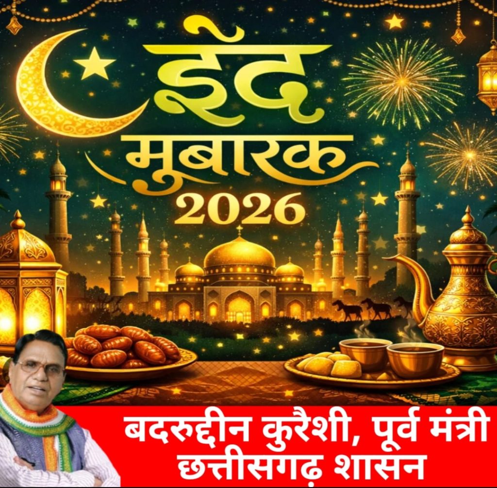 भिलाई/छत्तीसगढ़ के पूर्व मंत्री बदरुद्दीन कुरैशी ने कहा कि, आज 21 मार्च के मुबारक मौके पर ईद उल फितर की दिल से मुबारकबाद l यह रमजान के रोज पूरे महीने का इबादत और सब्र के बाद आने वाली यह ईद हम सबके लिए खुशियों, बरकत और सुकून लेकर आए l अल्लाह ताला से दुआ है कि वह हम सब की दुआओं को कबूल फरमाए और हमारे मुल्क में शांति, तरक्की और आपसी एकता कायम रखें l आईये हम सब मिलकर नफरत को मिटाकर मोहब्बत और भाईचारे को बढ़ावा दे l तमाम अहल ए वतन को ईद उल फितर की मुबारकबाद और शुभकामनाएं l