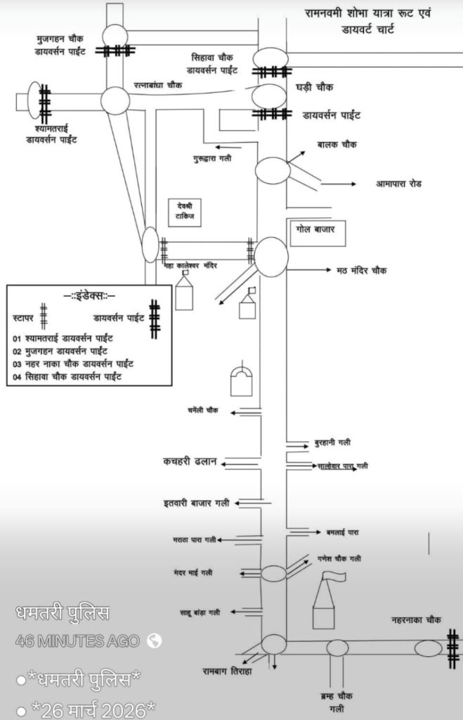 01 जगदलपुर की ओर से रायपुर जाने वालेः- श्यामतराई बायपास होते हुए रायपुर की ओर। 02 दुर्ग की ओर से आने वाले वाहन- बायपास होते हुए खपरी से अर्जुनी मोंड़ होकर सिहावा चौक से नगरी सिहावा की ओर जा सकते है। 03 रायपुर की ओर से जगदलपुर जाने वालेः- संबलपुर बायपास से श्यामतराई बायपास होते हुए जगदलपुर की ओर। 04 जगदलपुर से नगरी-सिहावा बोरई की ओर जाने वालेः-श्यामतराई बायपास से संबलपुर बायपास होते हुए अर्जुनी मोंड़, सिहावा चौक, शांति कालोनी, नहर नाका से नगरी-सिहावा की ओर। 05 नगरी-सिहावा की ओर से जगदलपुर जाने वालेः-* नहरनाका से शांति कालोनी, सिहावा चौक, अर्जुनी मोंड़ से संबलपुर बायपास होते हुए श्यामतराई बायपास से जगदलपुर की ओर जा सकते है। शाम 4:00 बजे से शोभायात्रा के समाप्ति तक घडी चौक से विंध्यवासिनी मंदिर तक सभी प्रकार की छोटी बड़ी वाहनें सदर मार्ग में पूर्ण प्रतिबंध रहेगा। गंतव्य तक पहुंचने के लिए सदर मार्ग से लगे सहायक मार्गों से आवागमन किया जावेगा।शोभायात्रा के दौरान सादी वर्दी में तैनात जवानों एवं सीसीटीवी कैमरा के माध्यम से संदिग्ध व्यक्तियों एवं संदिग्ध गतिविधियों पर निगाह रखी जावेगी।यातायात पुलिस अपील करती है कि रामनवमीं शोभायात्रा के दौरान कोई संदिग्ध व्यक्ति दिखने या अप्रिय स्थिति निर्मित होने पर तत्काल ड्यूटी में कार्यरत पुलिस अधिकारियों को सूचित करें एवं कंट्रोल रूम धमतरी के मोनं. 94791-92299 में सूचना देगें।
