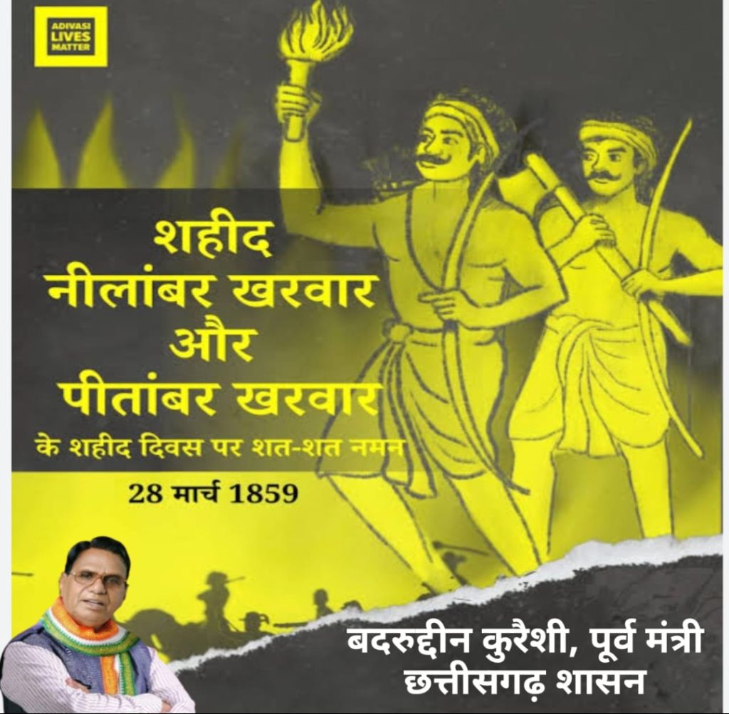 भिलाई/छत्तीसगढ़ के पूर्व मंत्री बदरुद्दीन कुरैशी ने कहा कि, नीलांबर और पीतांबर भारतीय स्वतंत्रता संग्राम के ऐसे अमीर वीर थे जिन्होंने अंग्रेजी शासन के विरुद्ध अदम्य साहस और बलिदान का परिचय दिया l 28 मार्च उनकी पुण्यतिथि के रूप में श्रद्धा और सम्मान के साथ मनाई जाती है । इस अवसर पर हम उनके संघर्ष त्याग और देशभक्ति को नमन करते हैं उन्होंने अपने प्राणों की आहुति देकर देश को आजादी की राह दिखाई और आने वाली पीढियां के लिए प्रेरणा स्रोत बने । उनका जीवन हमें यहां सीखता है कि देश की सदस्यता और सम्मान के लिए हर कठिनाई का सामना करना चाहिए । आज के दिन हम सभी को उनके आदर्शों को अपनाकर राष्ट्र के प्रति अपने कर्तव्यों का पालन करने का संकल्प लेना चाहिए l