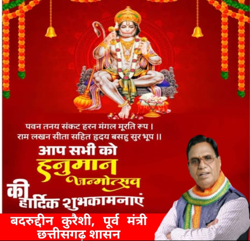 भिलाई/छत्तीसगढ़ के पूर्व मंत्री बदरुद्दीन कुरैशी,समस्त देशवासियों को पावन पर्व हनुमान जयंती की हार्दिक शुभकामनाएं । पवित्र अवसर हमें भगवान श्री हनुमान जी की अद्वितीय साहस , अटूट भक्ति और निस्वार्थ सेवा की प्रेरणा देता है ।हनुमान जी की तरह हमें भी अपने जीवन में सत्य निष्ठा और परिश्रम को अपनाते हुए समाज और राष्ट्र की सेवा के लिए सदैव तत्पर रहना चाहिए । इस शुभ दिन पर देश की एकता शांति और समृद्धि और हनुमान जी की कृपा से सभी के जीवन में सुख स्वस्थ और सफलता का वास हो।