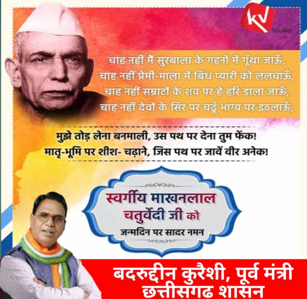 भिलाई/छत्तीसगढ़ के पूर्व मंत्री बदरुद्दीन कुरैशी ने , 4 अप्रैल को महान स्वतंत्रता सेनानी प्रखर पत्रकार साहित्यकार एवं राष्ट्रभक्ति माखनलाल चतुर्वेदी की जयंती श्रद्धा और सम्मान के साथ मनाई जाती है । उनका जन्म चार अप्रैल 1889 को मध्य प्रदेश के होशंगाबाद जिले में हुआ था । वह भारतीय राष्ट्रीय कांग्रेस से जुड़े सकरी नेता थे और स्वतंत्रता आंदोलन में उन्होंने महत्वपूर्ण भूमिका निभाई उन्होंने अंग्रेजी शासन के विरुद्ध जन जागरण के लिए अपने लेखन और पत्रकारिता को हथियार बनाया ।माखनलाल चतुर्वेदी प्रभा, कर्मवीर और प्रताप जैसे पत्रों के संपादन के माध्यम से देशभक्ति की भावना को जन-जन तक पहुंचाते रहे उनकी प्रसिद्ध कविता “पुष्प की अभिलाषा” आज भी युवाओं में देश प्रेम की प्रेरणा जागती है । कांग्रेस दल के एक समर्पित कार्यकर्ता के रूप में उन्होंने सत्याग्रह आंदोलन में भाग ललिया और कई बार जेल भी गए । उनका जीवन सादगी त्याग और राष्ट्र सेवा का अद्भुत उदाहरण है माखन लाल चतुर्वेदी का साहित्य और उनका संघर्षपूर्ण इतिहास आज भी हमें देश के प्रति कर्तव्यनिष्ठा रहने की प्रेरणा देता है ।उनकी जयंती पर हम उनके आदर्श को अपने और राष्ट्रीय हित में कार्य करने का संकल्प हैं ।