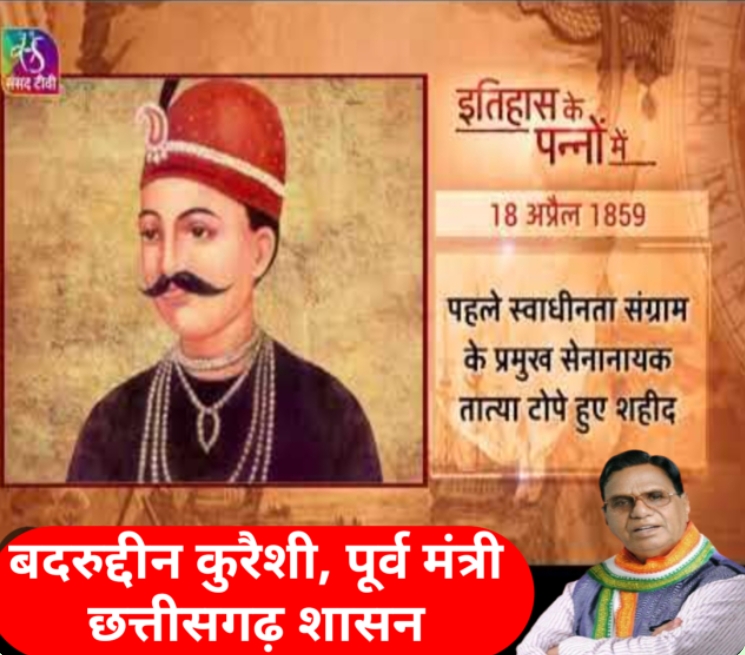 भिलाई/छत्तीसगढ़ के पूर्व मंत्री बदरुद्दीन कुरैशी ने कहा कि, 18 अप्रैल को महान स्वतंत्रता सेनानी तात्या टोपे की पुण्यतिथि पर उन्हें श्रद्धा पूर्वक नमन किया जाता है l तात्या टोपे का वास्तविक नाम रामचंद्र पांडुरंग था और वह 1857 के प्रथम स्वतंत्रता संग्राम के प्रमुख नेताओं में से एक थे । वे नाना साहब के विश्व युद्ध सहयोगी थे और अंग्रेजों के विरुद्ध अनेक युद्ध में अपनी अद्भुत सैन्य रणनीति और साहस का परिचय दिया । कानपुर झांसी और ग्वालियर जैसे क्षेत्रों में उन्होंने अंग्रेजों को कड़ी टक्कर दिया । रानी लक्ष्मीबाई के साथ मिलकर उन्होंने स्वतंत्रता की लड़ाई को नई दिशा दी। अंग्रेजों ने उन्हें पकड़ने के लिए अनेक प्रयास किया और अंधता विश्वास घात के कारण वे 1859 में गिरफ्तार कर लिए गए । 18 अप्रैल 1859 को उन्हें शिवपुरी में फांसी दे दी गई। उनके बलिदान भारतीय स्वतंत्रता संग्राम के इतिहास में अमिट है । तात्या टोपे की पुण्यतिथि हमें देशभक्ति साहस और त्याग की प्रेरणा देती है हमें उनके आदर्शों को अपनाकर राष्ट्रीय की सेवा के लिए सदैव तत्पर रहना चाहिए और यह संदेश आज के युवा पीढ़ी के लिए बहुत ज्यादा आवश्यक है । यह संदेश व जानकारी आज के युवा पीढ़ी के लिए शिक्षा के स्तर को बढ़ाता है।