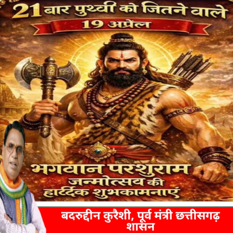 भिलाई/छत्तीसगढ़ के पूर्व मंत्री बदरुद्दीन कुरैशी ने कहा कि, भगवान परशुराम की जयंती 19 अप्रैल को हिंदू धर्म में अत्यंत श्रद्धा और उत्साह के साथ मनाई जाती है । यह पर्व भगवान विष्णु के छठे अवतार परशुराम जी की जन्मोत्सव के रूप में मनाया जाता है, जिनका जन्म वैशाख मास के शुक्ल पक्ष की तृतीया तिथि को हुआ था । धार्मिक मान्यताओं के अनुसार परशुराम जी का जन्म एक ऐसे समय में हुआ जब पृथ्वी पर धर्म और अन्याय बढ़ गया था । उन्होंने अत्याचारी क्षत्रियों का विनाश कर धर्म की स्थापना की और समाज में न्याय हुआ संतुलन बनाए रखने का संदेश दिया। परशुराम जी को पराक्रम त्याग और सत्य के प्रतीक के रूप में पूजा जाता है । उनके हाथ में धारण किया गया परसा (कुल्हाड़ी) उनके साहस और धर्म रक्षा के संकल्प का प्रतीक है । इस दिन लोग व्रत रखते हैं पूजा, अर्चना करते हैं तथा उनके आदर्शों को अपनाने का संकल्प लेते हैं ।