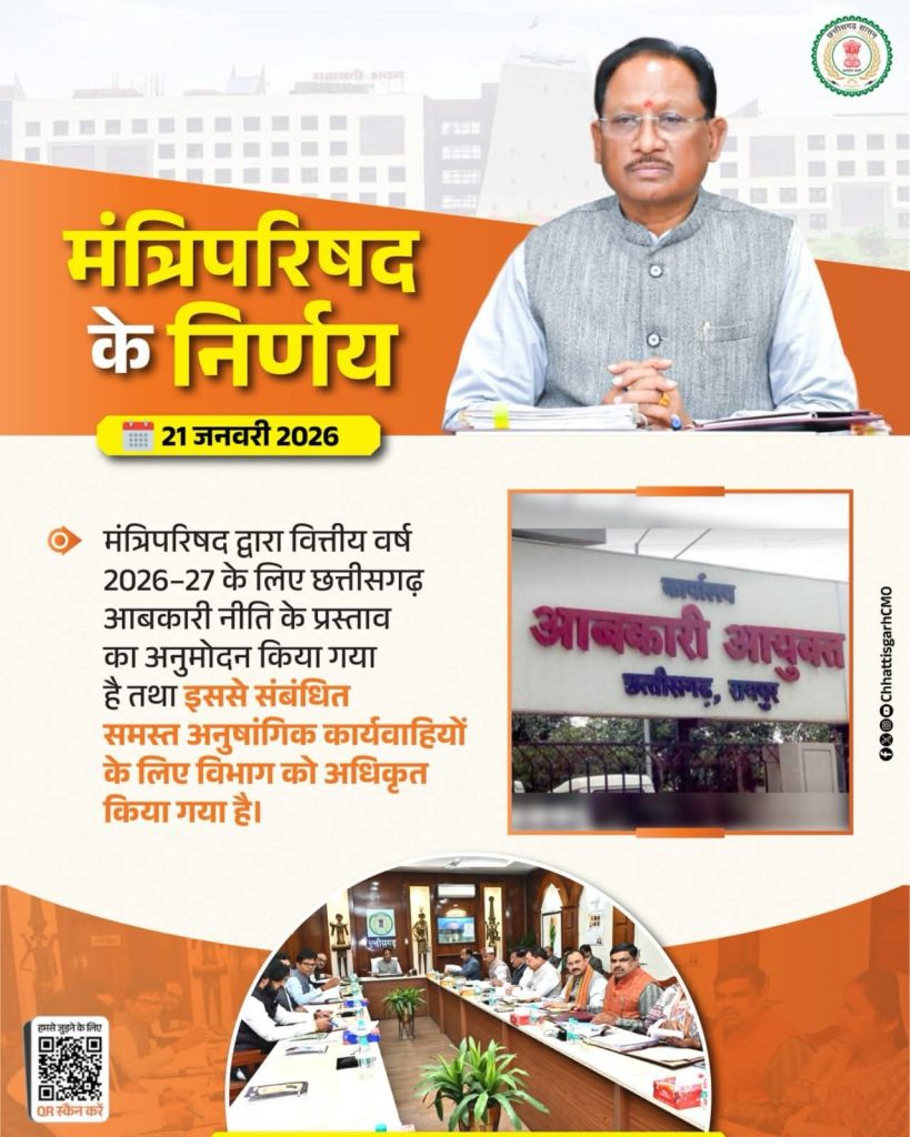 रायपुर/मंत्रिपरिषद द्वारा वित्तीय वर्ष 2026–27 के लिए छत्तीसगढ़ आबकारी नीति के प्रस्ताव का अनुमोदन किया गया है तथा इससे संबंधित समस्त अनुषांगिक कार्यवाहियों के लिए विभाग को अधिकृत किया गया है। मंत्रिपरिषद द्वारा नवा रायपुर अटल नगर में उच्च कोटि के शैक्षणिक संस्थान की स्थापना हेतु श्री विले पारले कलावनी मंडल (SVKM) को उनके नरसी मोंजी प्रबंधन अध्ययन संस्थान की स्थापना के लिए सेक्टर-18 में चिन्हांकित लगभग 40 एकड़ भू-खंड को एकमुश्त 90 वर्षों की लीज पर आबंटित किए जाने की स्वीकृति प्रदान की गई है। नवा रायपुर में इस राष्ट्रीय स्तर के संस्थान की स्थापना से राज्य में आधुनिक एवं गुणवत्तापूर्ण शिक्षा को और अधिक मजबूती मिलेगी।